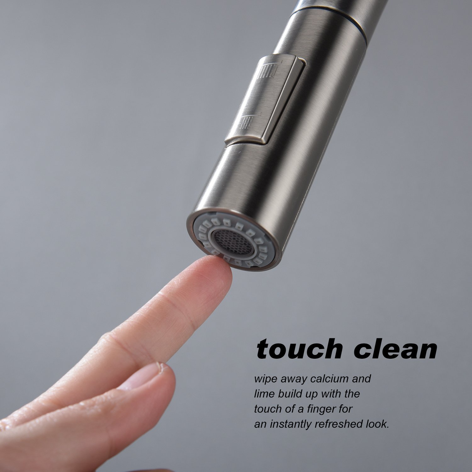 Dual mode setting  Your kitchen faucet comes equipped with a pull down sprayer that; thanks to its hard rubber sprayer hole; provides a soft inflatable flow of water and a strong spray without splash.360 degree kitchen sink faucet sprayer.